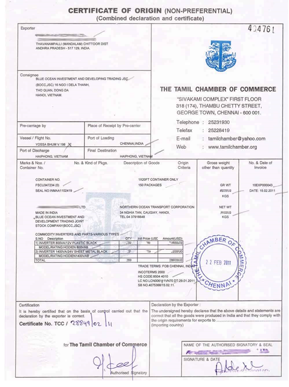 Trong ví dụ CO ở hình trên, lô hàng có nguồn gốc xuất xứ từ Ấn Độ, thể hiện qua cụm từ "Made in India", được xác nhận bởi Phòng thương mại ở Tamil, Ấn Độ.